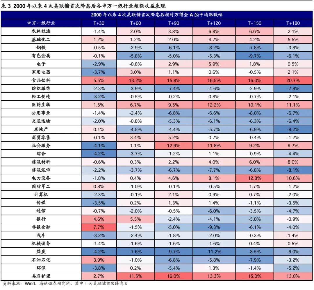 行业:美联储降息短期利好A股金融、食饮等消费行业,中期科技逐步占优。进一步观察2000年以来4次美联储降息后30、60、90、120、150、180天内各申万一级行业相对万得全A的平均涨跌幅,得到如下结论:①短期维度,直接受益于宏观流动性改善的金融行业率先跑赢,同时外资偏好的食饮、美护等消费行业涨幅始终靠前。美联储首次降息落地1个月内,非银、银行的表现最强,外资偏好的食品饮料、美容护理涨跌幅也逐步占优,此外石油、化工等部分资源品行业表现也相对较强;而在降息落地1-3个月内,食品饮料、美容护理的表现愈发强劲,医药行业也逐渐跑赢。②中期维度,社服、电力设备行业逐渐跑赢,利率敏感的电子、计算机等科技行业逐步占优。美联储首次降息落地3-6个月内,社会服务行业的涨幅较为显著,电力设备行业的表现渐强。此外,电子、计算机等科技行业的超额收益有所改善,但由于受多种因素的影响,科技行业在历次降息后的表现差异较大,例如2019年在自主可控与5G催化的加持下电子涨幅明显,而2001年科网泡沫破裂导致电子行业股价承压。