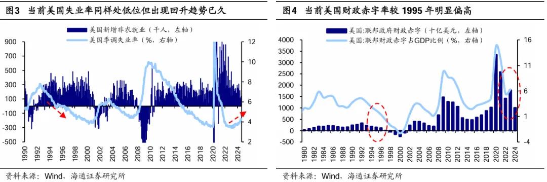 不一样的是,这次失业率处在回升趋势中,且政府赤字率明显偏高。尽管从大体上看,当前宏观背景与1995年相似,但在失业率变动趋势及政府赤字水平上仍存在不同。从失业率看,虽然当前与1995年失业率绝对水平均偏低,但本轮失业率出现回升趋势已久,自2023/04底点累计上升16个月、80个百分点;而1995年由于美国劳动市场供需平衡,失业率长期趋势性回落,仅临近降息时抬升3个月、20个百分点。从赤字率看,当前美国财政赤字较1995年明显上升,2023年底美国财政赤字占GDP比重高达6.3%;而1995年克林顿政府上台后实施紧缩财政政策,政府赤字率仅为2.2%。