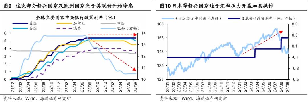 海外货币政策:本次美联储降息时点偏晚,全球央行政策协调性有所下降。回顾历史,过去美联储通常领先全球央行开启降息周期,例如在1995年-1996年全球央行降息周期内,日本央行、美联储率先降息,随后英国、中国、澳大利亚、印度等国家央行陆续跟进;再比如2001-2003年的全球央行降息周期也是由美联储开启,逐步传导至日本、澳大利亚、英国、印度等其他央行。然而这次全球央行政策协调性有所下降:一方面,部分新兴国家与欧洲国家在经济重压下先行开启降息,中国(2021/12)、智利(2023/07)、巴西(2023/09)率先降息,今年以来瑞士(2024/03)、瑞典(2024/05)、加拿大/欧元区(2024/06)、英国/新西兰(2024/08)央行也陆续降息,而美联储这次的降息启动时点较晚;另一方面,日本、印尼等国家迫于汇率贬值压力进行加息,具体来说,日本央行于2024/03宣布退出负利率、并于2024/07再次加息,主要为应对2024年以来日元的加速贬值,今年美元兑日元中间价从年初的143一度升至7月初的162。