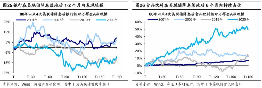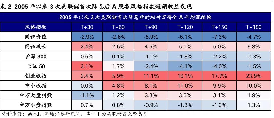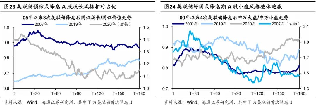 风格:美联储预防式降息A股成长跑赢,纾困式降息A股价值占优。统计2005年以来美联储3次降息后30、60、90、120、150、180天内成长/价值、大盘/小盘风格指数的表现,可以发现:①预防式降息期A股成长风格胜率更高,大小盘风格不明显。2019年首次预防式降息落地后半年内国证成长/国证价值持续上升;申万大盘/申万小盘走势较为徘徊,降息落地后3个月内大盘风格略微跑赢,但6个月内小盘风格表现更优。②纾困式降息期A股价值、小盘风格占优。2007、2020年首次纾困式降息落地后半年内成长风格整体跑赢;2001、2007、2020年申万大盘/申万小盘走势略有分歧,其中前两次小盘跑赢,后一次大盘更强,因此综合看小盘胜率更高。③首次降息落地1个月内成长、大盘风格表现更优。理论上讲,由于降息有助于降低企业融资成本,因此依赖外部资金、处于高速扩张期的成长型公司或更加受益。从实际情况看,短期内确实如此,成长风格在2007、2019、2020年降息落地后0.5-1个月内均跑赢,此外大盘风格在2001、2007、2020年3次降息落地后1个月内短暂跑赢,但中期视角下成长、大盘风格并不持续占优。回到本次降息,前文我们预计这次美联储大概率预防式降息,因此往后看短期内大盘成长风格或有一定表现,中期维度成长风格表现或相对更强。