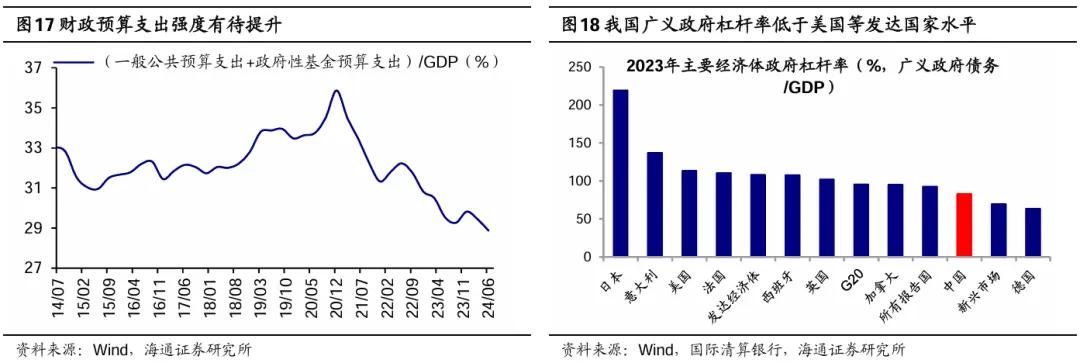 一是监管层释放稳增长信号,财政有望发力提振内需。近期监管层的发言和出台的一系列政策显示稳增长正在发力,例如9月12日习近平总书记在甘肃省兰州市发言强调“抓好三季度末和四季度经济工作,努力完成全年经济社会发展目标任务”;9月14日国家金融监督管理总局发布《关于促进非银行金融机构支持大规模设备更新和消费品以旧换新行动的通知》,鼓励非银机构支持大规模设备更新和消费品以旧换新行动。此外,730政治局会议提出“宏观政策要持续用力、更加给力”,财政政策已在逐步发力,9月14日财政部宣布拟发行2024年第六期超长期特别国债。若我们以两本账的支出占GDP的比重衡量财政强度,2023年、2024年上半年分别为29.8%、28.9%,明显不如2018-2020年水平。根据国际清算银行统计,23年我国广义政府杠杆率为83%,明显低于美国(113%)等发达经济体,当前我国财政支出仍有发力空间。