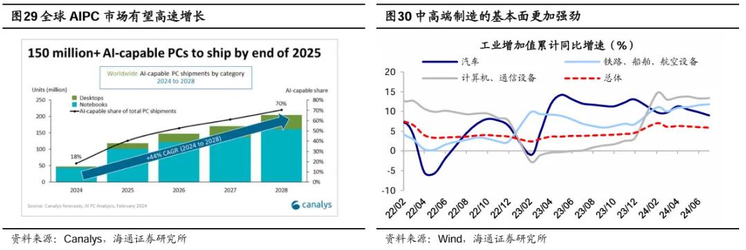 基本面更优的中国优势制造有望成为A股中期主线。借鉴历史,我们认为本轮美联储预防式降息短期内利好金融行业,同时食饮、美护等受到外资偏好的消费行业也有望跑赢;但从中期维度看,电子等科技行业可能逐渐占优。二十届三中全会指出,“要健全因地制宜发展新质生产力体制机制”,中期维度看,围绕高水平科技自立自强,中国优势制造有望成为引领新质生产力发展的重要板块,因此相关板块业绩确定性或更强,具体关注具备出口竞争优势的中高端制造和引领新质生产力发展的科技制造。