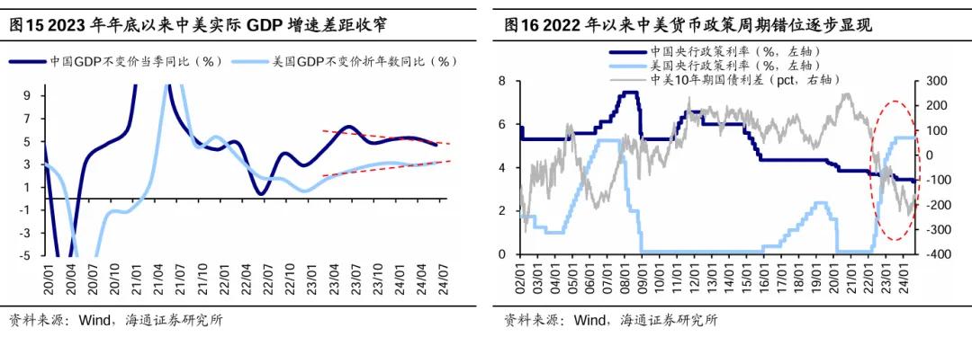 本次美联储降息前国内经济也偏弱,不同的是这次我国央行先于美联储开启降息。事实上,21年底以来为刺激国内经济复苏,央行持续发力逆周期调节。具体而言,21年12月中央经济工作会议指出“经济发展面临需求收缩、供给冲击、预期转弱三重压力”,会后央行宣布降准,次月全面降息;22年俄乌冲突等外部风险因素增多,同时国内“三稳”面临新挑战,为此央行4月、11月两度降准,并于5月调降LPR利率,8月下调MLF、LPR利率;23年经济波浪式修复,经济运行面临国内需求不足、重点领域隐患增多等问题,央行再度转松,于3月、9月两度降准,6月、8月两次全面降息;今年以来经济整体回升向好,但有效需求仍然不足等问题仍然存在,央行于2月再次降准,并于7月下调LPR、MLF利率。站在当前时点,美联储降息预计在即,国内经济增长类似过往同样偏弱,不同之处在于这次我国央行于21年底提前开启降息,而美联储则自2022/03开始加息,这导致中美货币政策周期出现错位,反映在资产价格上就是中美10年期国债利差不断收窄、目前降至2002年以来11%的历史低位水平。