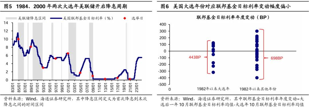 美国政治:本次降息恰逢大选年,大选年美联储仍可能降息但操作更谨慎。历史上美联储在美国大选年降息的情况并不常见,从历史经验看,大选年并不妨碍美联储开展降息。回顾1982年以来的10次大选,美联储曾在1984年、2000年两次大选前后开启降息,其中1984年首次降息发生在大选投票日前两个月,而2001年首次降息则发生在投票日后两个月。由此可见,大选年并不妨碍美联储进行必要的降息操作,衰退式降息与纾困式降息均有可能发生;美联储降息的具体时点并不确定,可能在大选日前、也可能在大选结束后。除此之外,大选年美联储操作通常会更偏谨慎。统计美国总统大选结束后一年内美联储利率的变动情况,考虑到美国大选通常在11月举行,我们通过计算大选结束后一年10月与大选年10月联邦基金目标利率均值之差来衡量美联储操作变动。统计结果显示,自1982年以来,美国大选年后一年内联邦基金利率的变动范围比其他年份更窄,变动幅度也较小,这表明美联储在大选年的操作可能更加谨慎。
