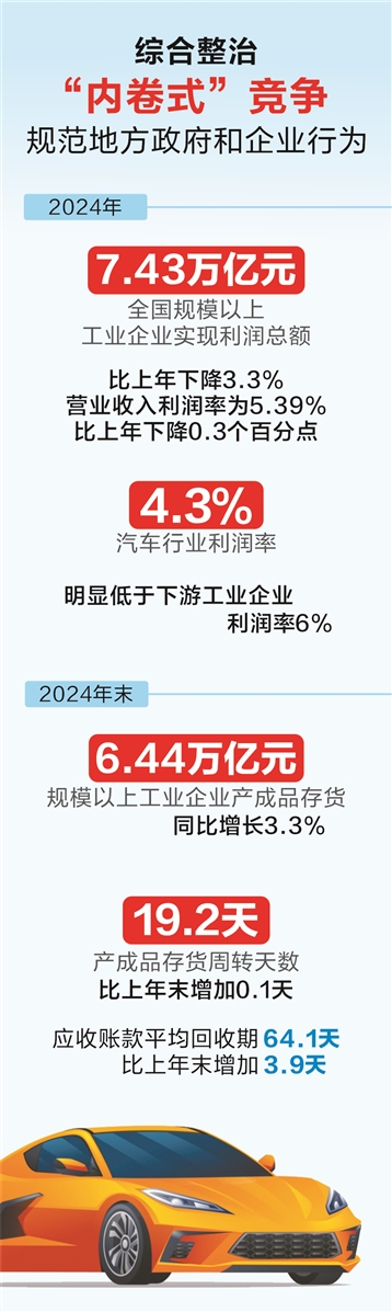 激烈的价格战导致行业的利润率大幅下降。中国汽车流通协会乘用车市场信息联席分会数据显示,2024年,汽车行业利润率仅为4.3%,明显低于下游工业企业利润率6%的平均水平。事实上,汽车行业只是一个缩影。据国家统计局数据,2024年,全国规模以上工业企业实现利润总额7.43万亿元,比上年下降3.3%;营业收入利润率为5.39%,比上年下降0.3个百分点。