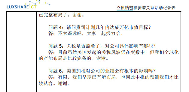 针对美国加税对公司业绩影响,立讯精密表示,“有限,我们早期已有所布局,也因此中报的预测我们才比较从容。”